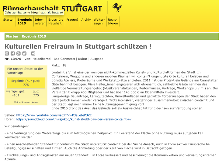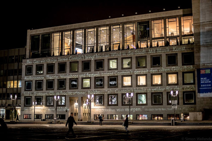 „Der Gemeinnützige Vereine Contain’t bringt frischen Wind in die Stadt. Mit Musik, Kunst, Performance, Theorie, Workshops und Festivals belebt Contain’t derzeit den alten Güterbahnhof in Stuttgart. Ob im Frachtcontainer, Holzbau, Zelt: Contain’t bleibt startklar für den nächsten Umzug- in eine lebhafte Stadtkultur von morgen.“