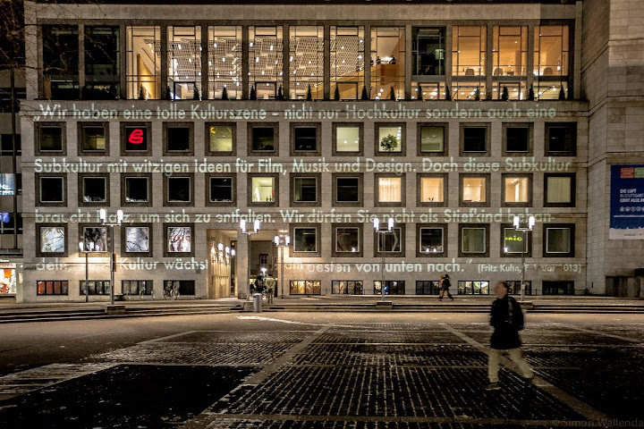 Mit einer Projektion aller Unterschriften, sowie interessanter Zitate auf dem Rathaus haben wir gestern Oberbürgermeister Fritz Kuhn an seine eigenen kulturpolitischen Pläne erinnert und das Problem dorthin getragen, wo es gelöst werden muss - ins Stuttgarter Rathaus. Wer „Chancen für neue, innovative Projekte“ auf „ Stadtbrachen und Freiräumen“ ankündigt, muss seine Politik auch an den Ergebnissen messen lassen.